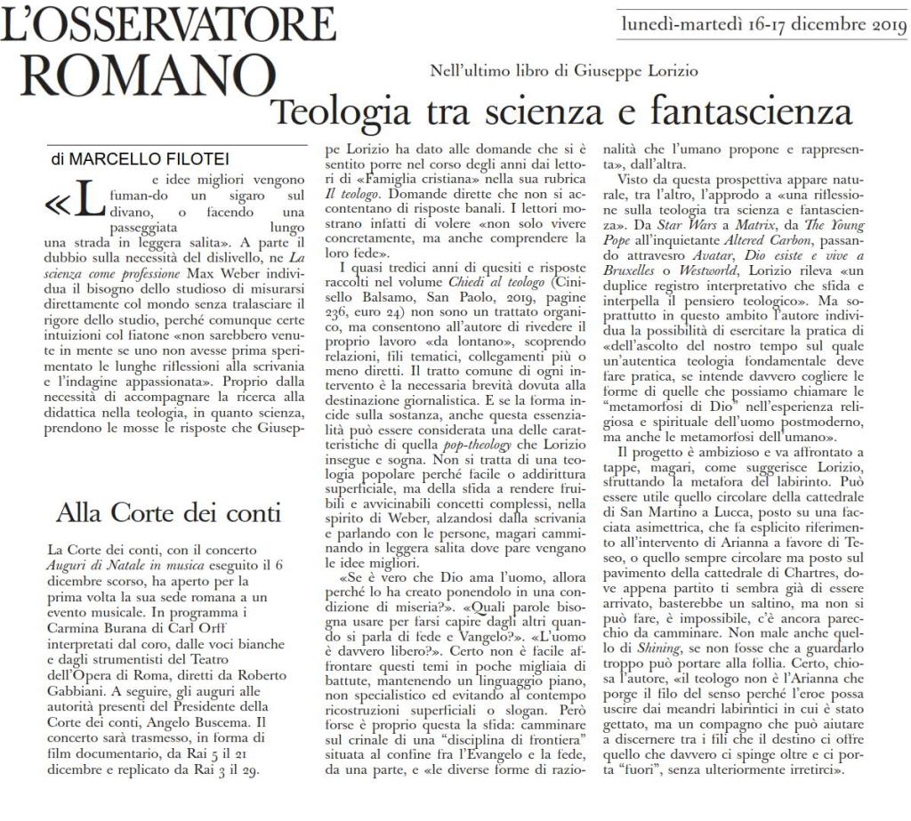 Pubblichiamo la recensione di Marcello Filotei, apparsa sull’Osservatore Romano del 16-17 Dicembre 2019, intitolata “teologia tra scienza e fantascienza” recensione al libro “Chiedi al teologo. Compagno di strada nel labirinto dell’esistenza” di Giuseppe Lorizio.