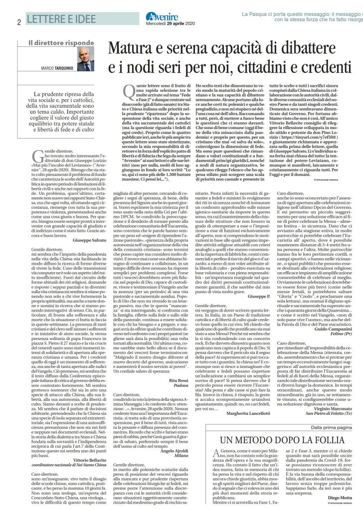 Riportiamo le risposte dei lettori e le considerazioni di Marco Tarquinio direttore di Avvenire riguardo al tema “Fede e Fase 2” del 29/04/2020, in cui è presente un sereno dibattito ispirato anche dal precedente articolo del prof. Lorizio del 28/04/2020