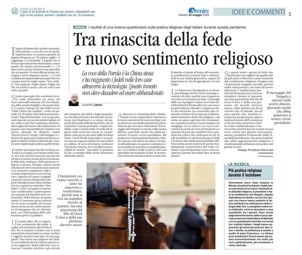 Articolo del prof. Lorizio, apparso su Avvenire il 23/05/2020.
