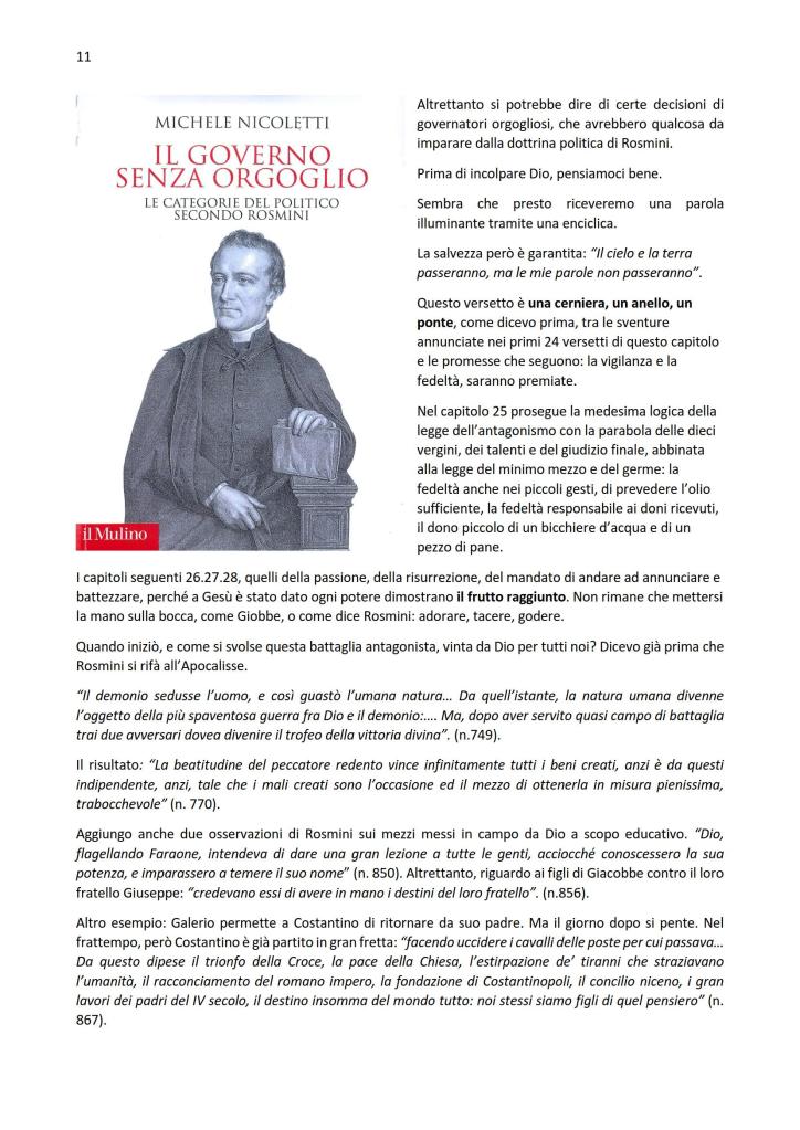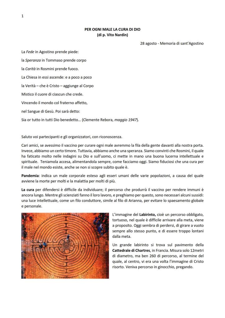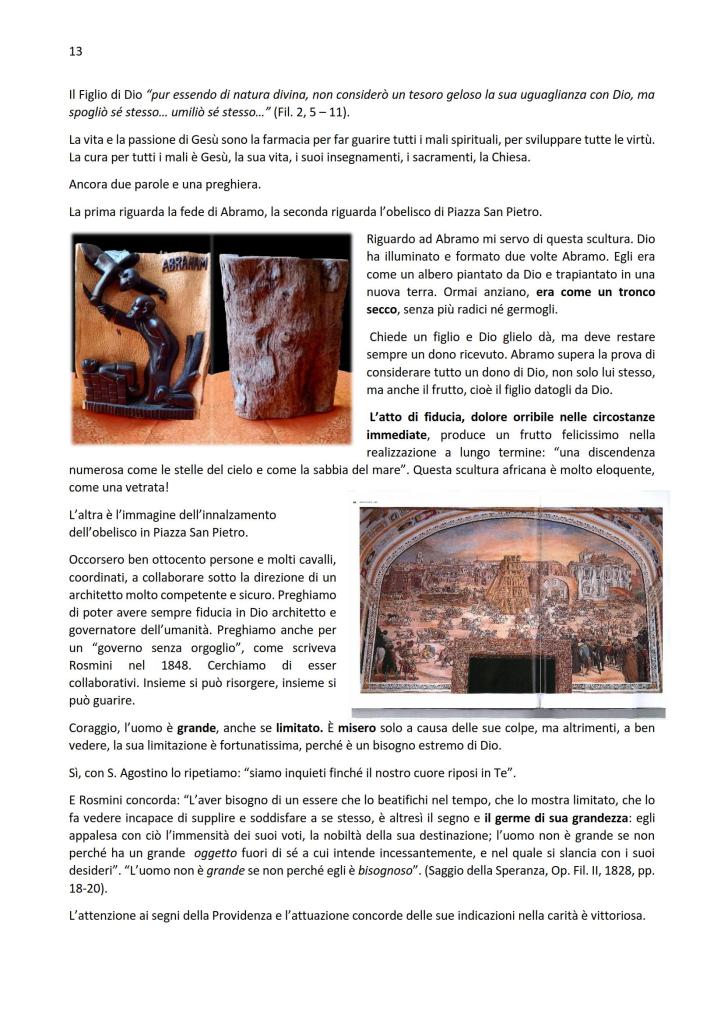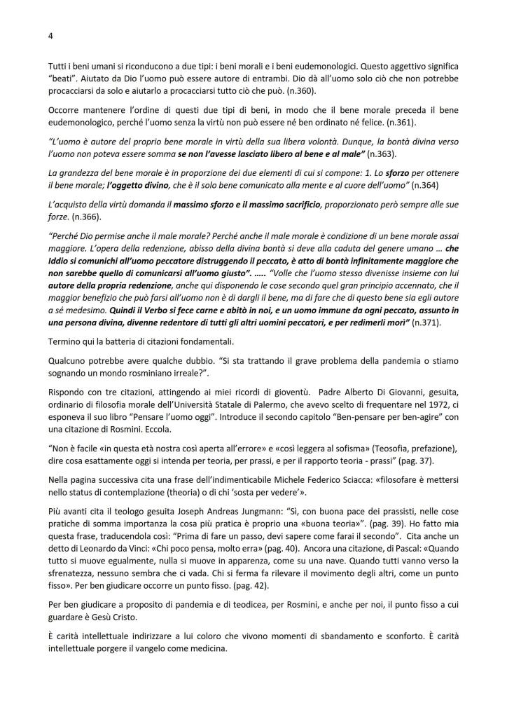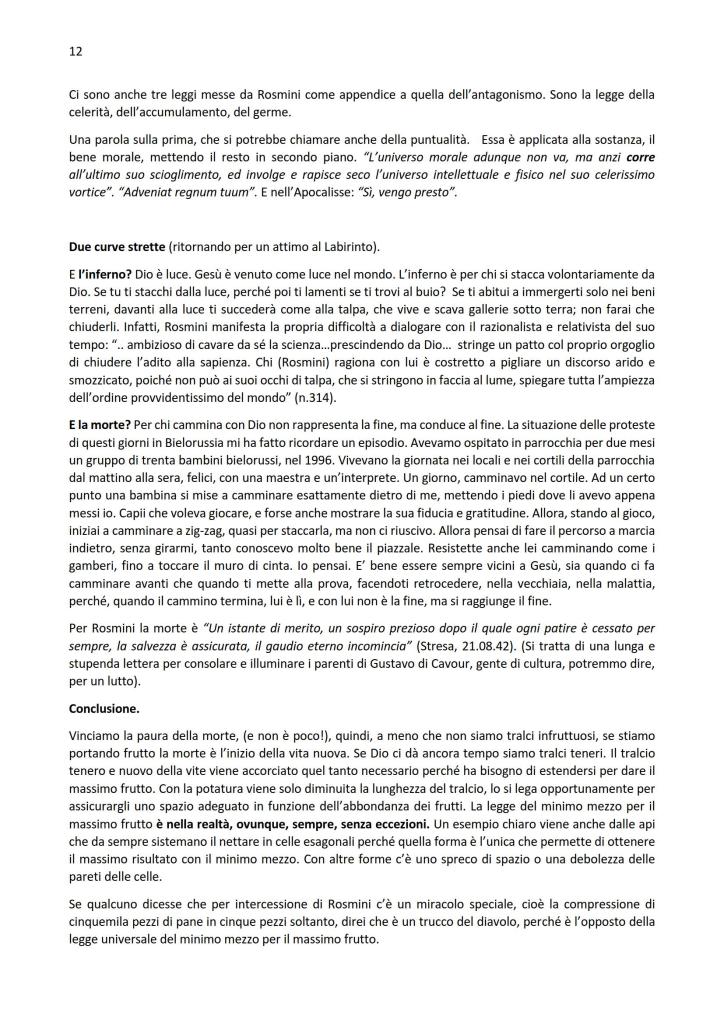 Cari amici, se avessimo il vaccino per curare ogni male avremmo la fila della gente davanti alla nostra porta. Invece, abbiamo un certo timore. Tuttavia, abbiamo anche una speranza. Siamo convinti che Rosmini, il qualeha faticato molto nelle indagini su Dio e sull’uomo, ci mette in mano una buona lucerna intellettuale e spirituale.