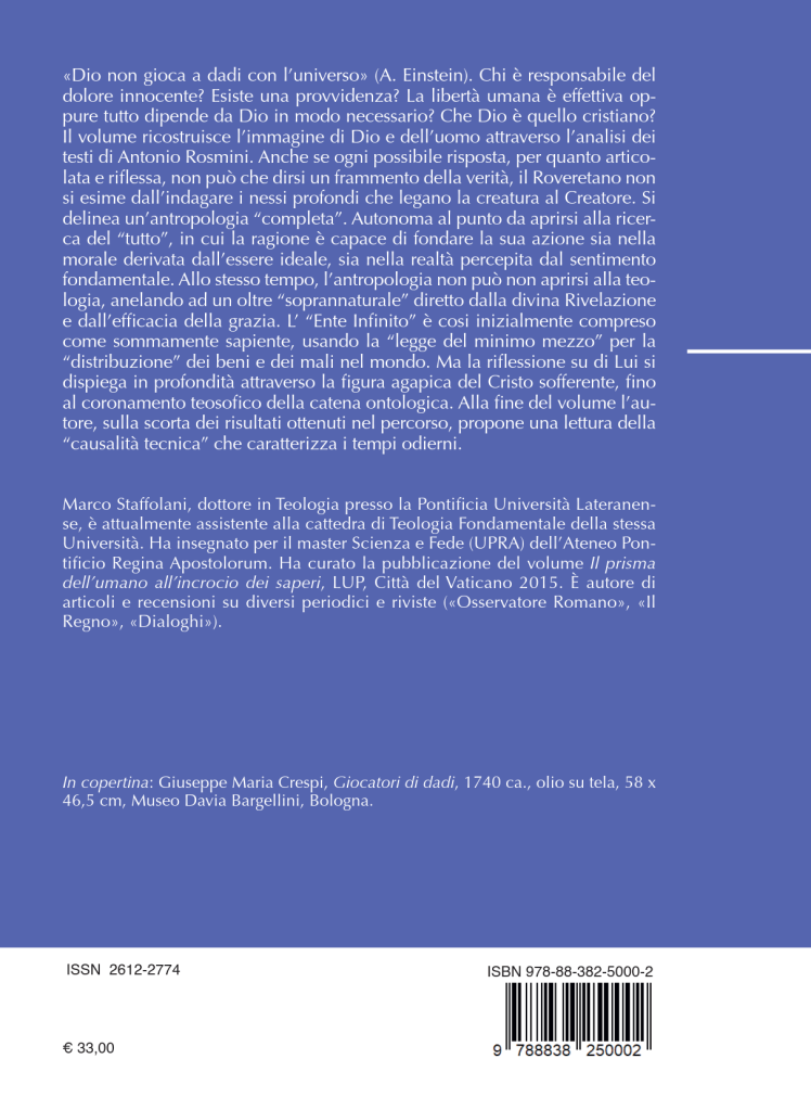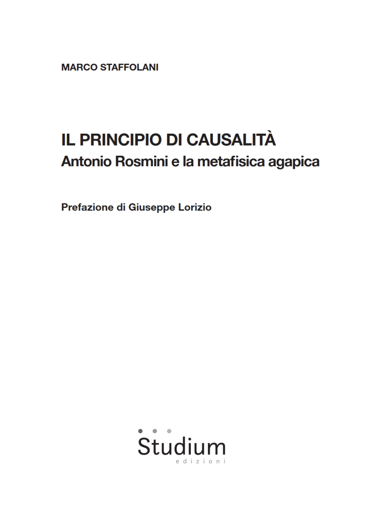 «Nonostante sia rivolto ad un autore dell’Ottocento, come Antonio Rosmini Serbati (1797-1855), il lavoro di Marco Staffolani risulta di sorprendente attualità e continuerà ad esserlo soprattutto in occasione di momenti tragici quale quello che il villaggio globale sta vivendo in questi mesi. E ciò soprattutto per la tematica che affronta e a partire dalla quale interroga il pensiero rosminiano, mettendone in luce la suggestiva prismaticità. La ricerca della causa (o delle cause) ci affligge spesso sia nella nostra esistenza quotidiana che quando ci troviamo di fronte ad eventi eccezionali. Finché non “possediamo” o “dominiamo” la causalità dei fenomeni, avvertiamo angoscia e senso di impotenza, allorché la intravediamo, ci apriamo alla speranza e alla possibilità di sconfiggere i mali. […] non sarà fuori luogo interpellare un maestro del pensiero quale è stato il Roveretano, per rinvenire nelle sue opere tracciati di risposta alle nostre domande di senso […] Staffolani ha opportunamente evitato di arrampicarsi sugli specchi per tentare attualizzazioni frettolose della tematica […] il lavoro certosino e puntuale dell’autore di questo prezioso volume consente di cogliere alcune perle, che non possono non interpellare l’oggi della storia» (dalla prefazione di G. Lorizio)