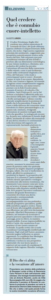 Proponiamo uno stralcio della prefazione di Giuseppe Lorizio al libro di Giammaria Canu, Pensare la fede nell’orizzonte della salvezza. Una teologia fondamentale ispirata ad Antonio Rosmini, uscito da Città Nuova (pagine 424, euro 32). Un saggio che attraverso il pensiero di Rosmini ne conferma la proposta di prendere sul serio la dimensione interiore della rivelazione: quel Dio che ci abita e dal quale prende forma la nostra irresistibile vocazione all’amore. (Avvenire/Agorà 14 Gennaio 2021)