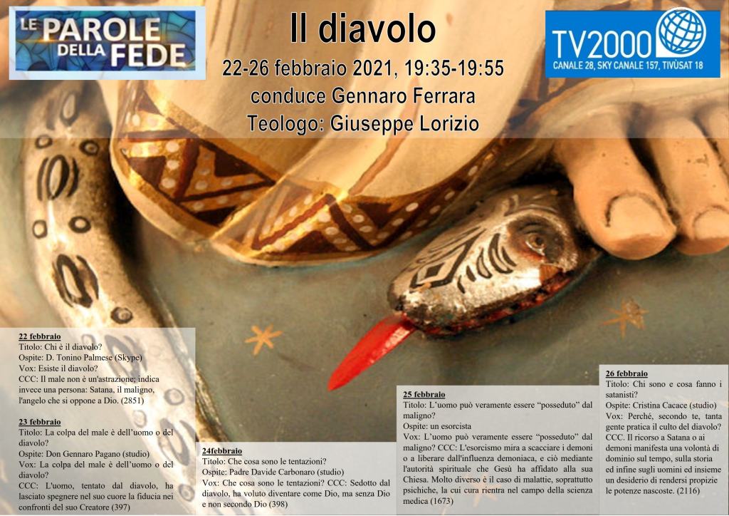 Tv2000. Le parole della fede. 5 puntate per interrogarsi sulla figura del “diavolo” 22-26 Febbraio 2021 pensarelafede Evento TV, Senza categoria 26 febbraio 202113 marzo 2021 1 Minute 1. Chi è il diavolo? 2. La colpa del male è dell’uomo o del diavolo? 3. Che cosa sono le tentazioni? 4. L’uomo può veramente essere “posseduto” dal maligno? 5. Chi sono e cosa fanno i satanisti? Condividi: Condividi su X (Si apre in una nuova finestra) X Condividi su Facebook (Si apre in una nuova finestra) Facebook Mi piace Caricamento... Correlati Pubblicato da pensarelafede Pensare La Fede e Vivere il Vangelo nell'oggi Vedi tutti gli articoli di pensarelafede Pubblicato 26 febbraio 202113 marzo 2021