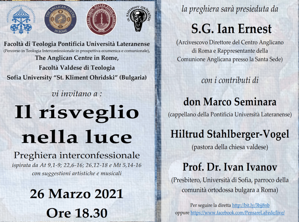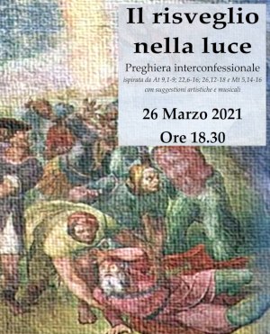 Preghiera interconfessionale “Il risveglio nella luce”, ispirata ad At 9,1-9; 22,6-16; 26,12-18 e Mt 5,14-16 con suggestioni artistiche e musicali. Ore 18.30 Venerdi 26 Marzo 2021. Aprirà l’incontro il rettore magnifico della pontifica Università Lateranense, prof. Vincenzo Buonomo. https://www.facebook.com/PensareLaFede/live/