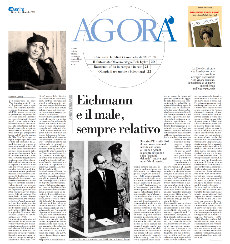 Sessant’anni or sono (precisamente l’11 aprile del 1961), si apriva a Gerusalemme il processo contro il criminale nazista Adolf Eichmann, che era stato prelevato in Argentina dal Mossad e condotto in Israele per essere lì giudicato, da quel popolo, ormai nazione, che aveva contribuito a massacrare. Nella sala stampa del tribunale, sedeva la pensatrice tedesca Hannah Arendt, una delle menti più perspicaci e