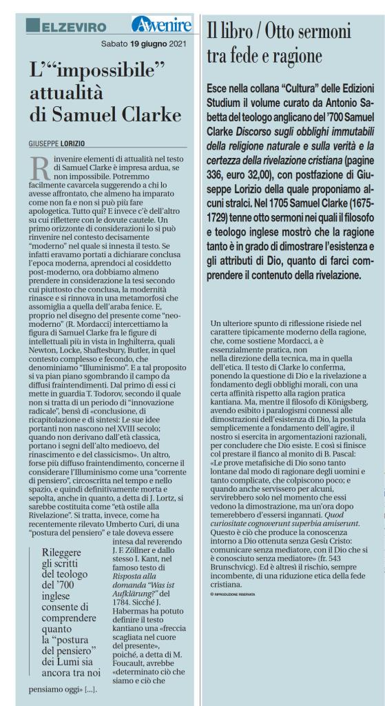 Articolo del prof. Lorizio su Avvenire Agorà del 19 Giugno in riferimento al libro del prof. Sabetta Discorso sugli obblighi immutabili della religione naturale e sulla verità e la certezza della rivelazione cristiana (Studium, pagine 336, euro 32,00) sul teologo anglicano del ’700 Samuel Clarke.