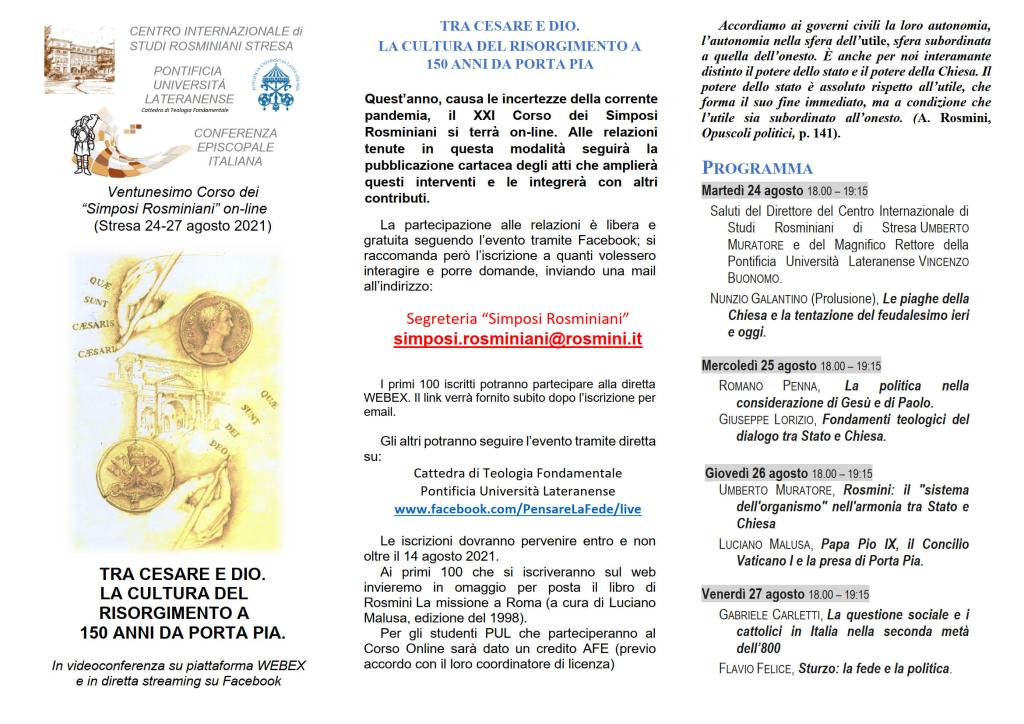 TRA CESARE E DIO.LA CULTURA DEL RISORGIMENTO A 150 ANNI DA PORTA PIA. Domani 24 agosto in diretta facebook ore 18.00
