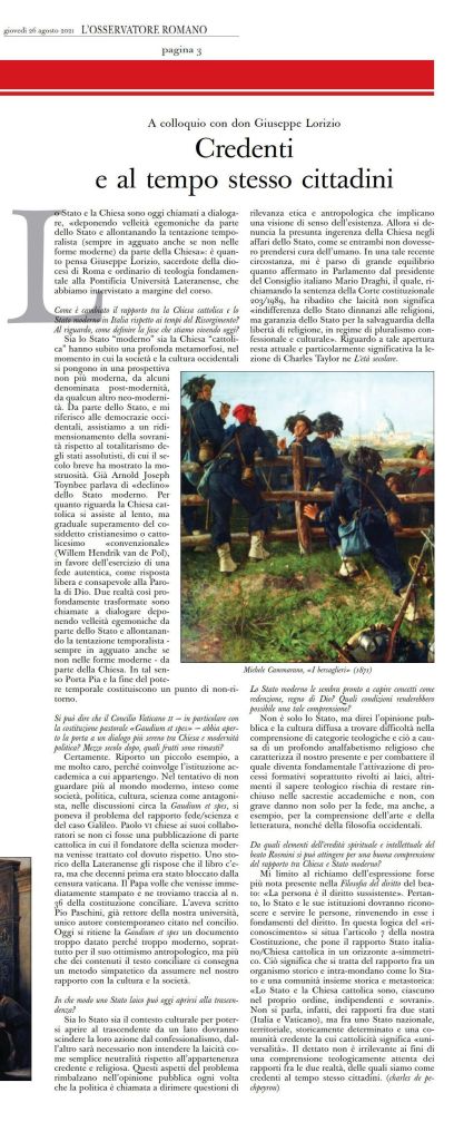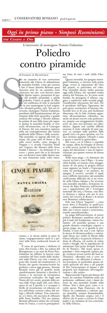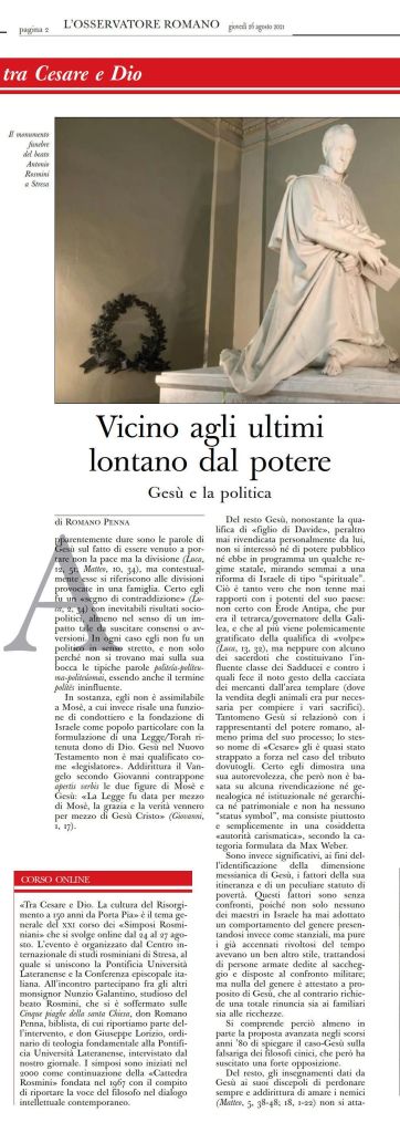 Articoli di Charles De Pechpeyrou (in riferimento alla prolusione di N. Galantino e colloquio con G. Lorizio), e di Romano Penna. Osservatore Romano 26 Agosto 2021.