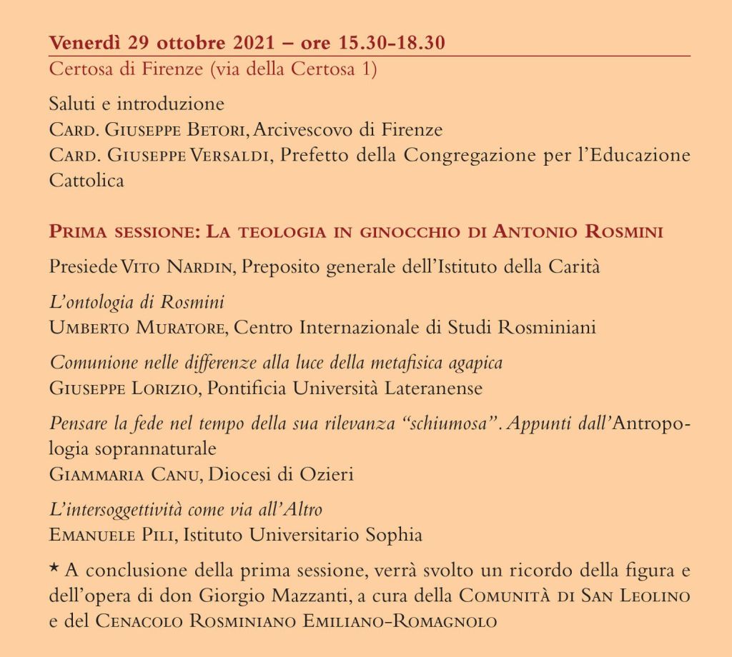 Antonio Rosmini. Unità di scienza e santità. Convegno internazionale di studi a vent’anni dalla Nota dottrinale sul suo pensiero (2001-2021) pensarelafede Senza categoria 28 ottobre 202128 ottobre 2021 1 Minute Relazione del prof. Lorizio 29 Ottobre alle 16.15Per collegamento in diretta, piattaforma Webex https://bit.ly/37CyeDh Condividi: Fai clic per condividere su X (Si apre in una nuova finestra) X Fai clic per condividere su Facebook (Si apre in una nuova finestra) Facebook Mi piace Caricamento... Correlati Pubblicato da pensarelafede Pensare La Fede e Vivere il Vangelo nell'oggi Vedi tutti gli articoli di pensarelafede Pubblicato 28 ottobre 202128 ottobre 2021