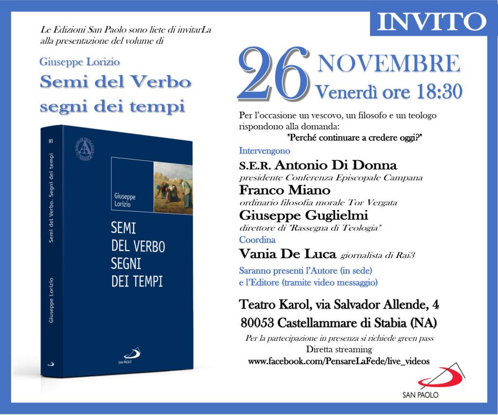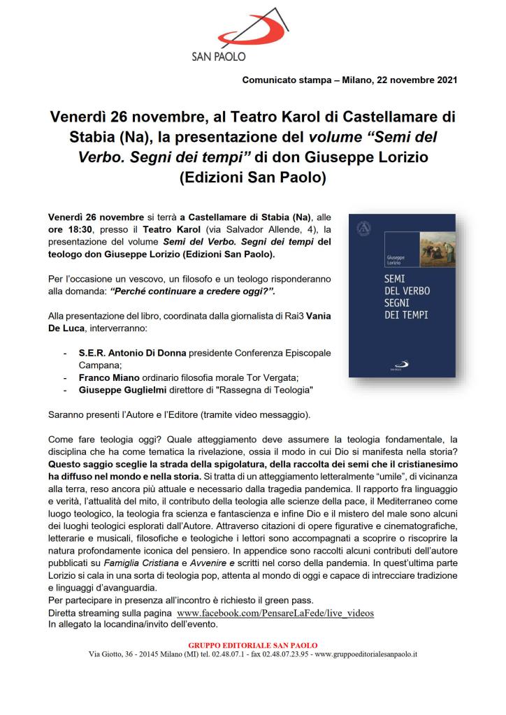 Comunicato Stampa delle Edizioni San Paolo: Venerdì 26 novembre si terrà a Castellamare di Stabia (Na), alle ore 18:30, presso il Teatro Karol (via Salvador Allende, 4), la presentazione del volume Semi del Verbo. Segni dei tempi del teologo don Giuseppe Lorizio (Edizioni San Paolo).