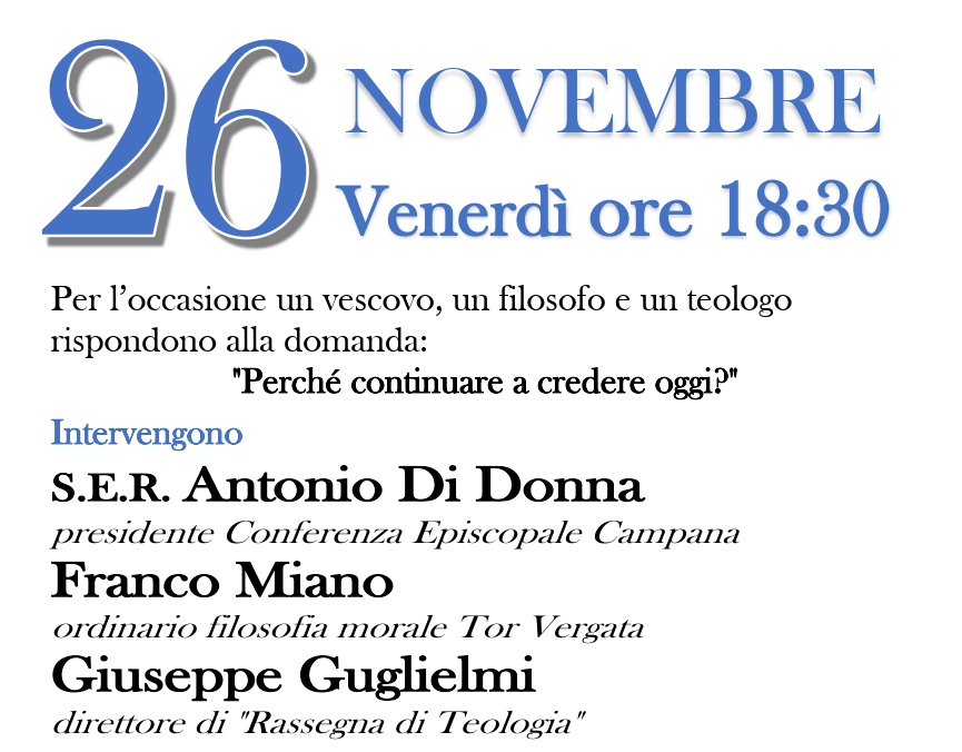 Per l’occasione un vescovo, un filosofo e un teologo risponderanno alla domanda: “Perché continuare a credere oggi?”.