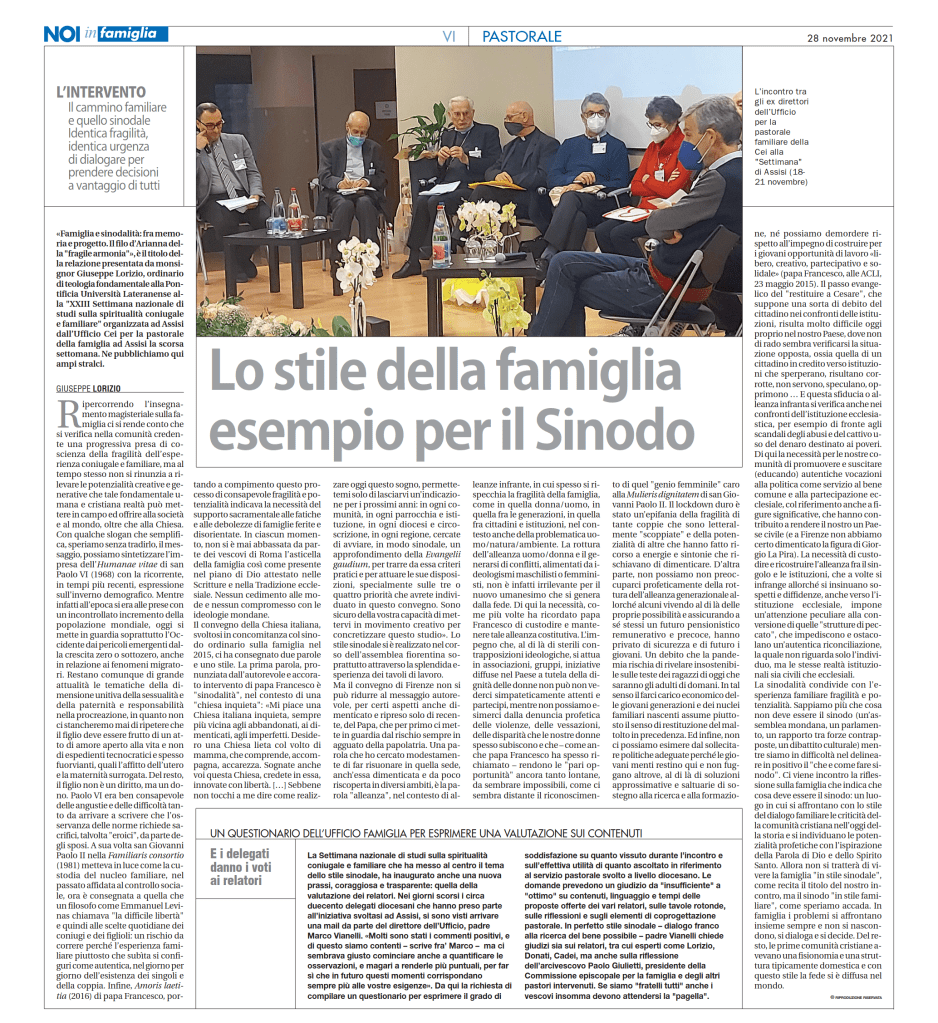 Ripercorrendo l’insegnamento magisteriale sulla famiglia ci si rende conto che si verifica nella comunità credente una progressiva presa di coscienza della fragilità dell’esperienza coniugale e familiare, ma al tempo stesso non si rinunzia a rilevare le potenzialità creative e generative che tale fondamentale umana e cristiana realtà può mettere in campo ed offrire alla società e al mondo, oltre che alla Chiesa… (Su avvenire, NOI in famiglia, 28 Novembre 2021)