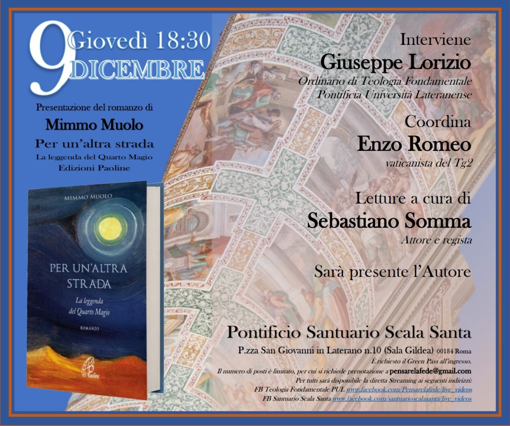 Presentazione del romanzo di Mimmo Muolo: Per un’altra strada, la leggenda del Quarto Magio, Edizioni Paoline. Giovedi 9 Dicembre ore 18.30. Presso Sala Gildea Pontificio Santuario Scala Santa P.zza San Giovanni in Laterano n.10 (Sala Gildea) 00184 Roma È richiesto il Green Pass all’ingresso. Il numero di posti è limitato, per cui si richiede prenotazione a pensarelafede@gmail.com