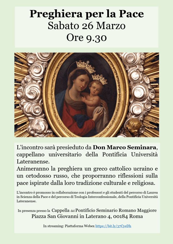 L’incontro è promosso in collaborazione con i professori e gli studenti del percorso di Laurea in Scienza della Pace e del percorso di Teologia Interconfessionale, della Pontificia Università Lateranense.