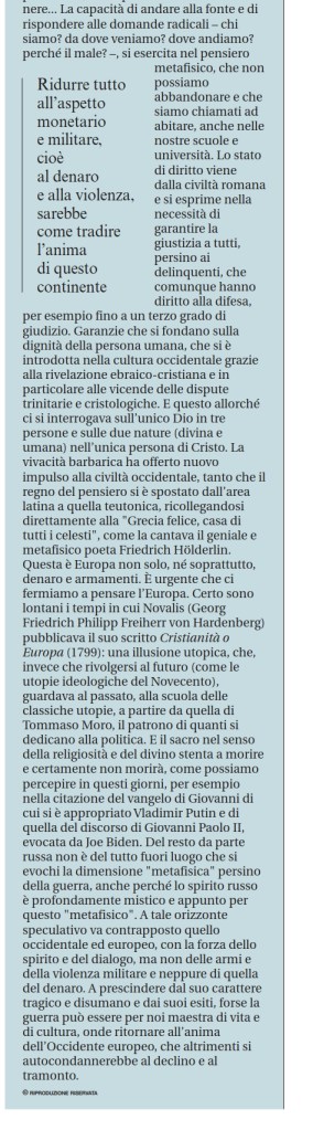 aderirvi. Ma nelle coscienze dei cittadini e di quanti hanno a cuore il futuro emerge una domanda: possibile che, dopo l’unione monetaria, sia da perseguire quella militare? Che immagine di Europa (e in un certo senso di cultura occidentale) ne emerge? Le sue fondamenta sarebbero il denaro e le armi. C’è da chiedersi se sia questo che vogliamo per il futuro nostro e dei ragazzi che lo erediteranno. (di Giuseppe Lorizio, Avvenire Agorà 30 Marzo 2022)