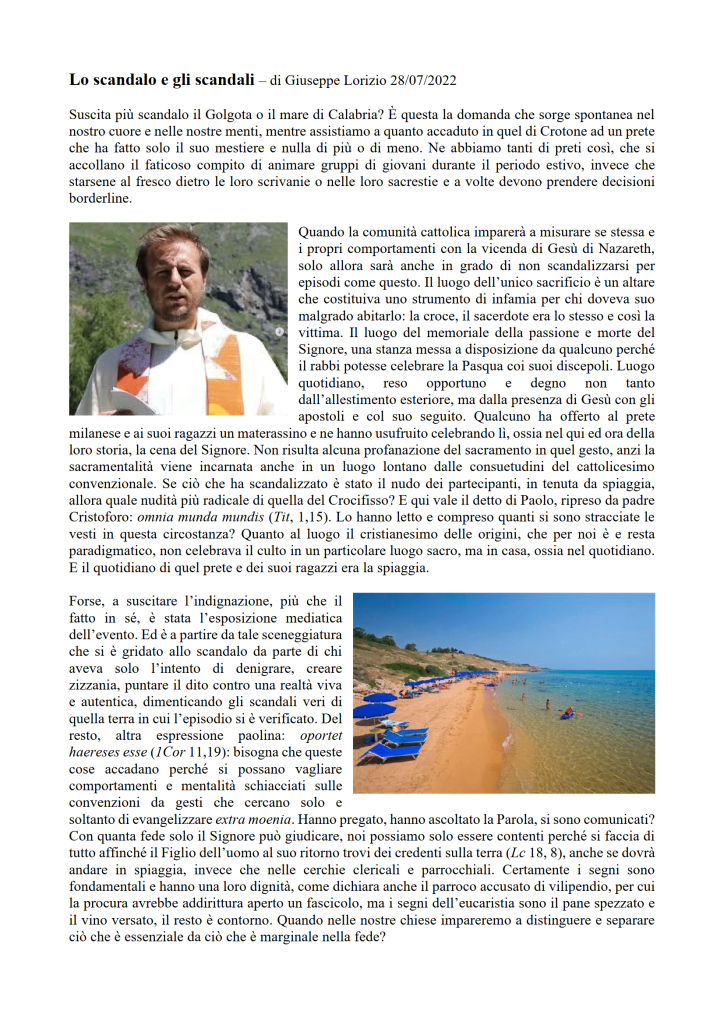 Suscita più scandalo il Golgota o il mare di Calabria? È questa la domanda che sorge spontanea nel nostro cuore e nelle nostre menti, mentre assistiamo a quanto accaduto in quel di Crotone ad un prete che ha fatto solo il suo mestiere e nulla di più o di meno. Ne abbiamo tanti di preti così, che si accollano il faticoso compito di animare gruppi di giovani durante il periodo estivo, invece che starsene al fresco dietro le loro scrivanie o nelle loro sacrestie e a volte devono prendere decisioni borderline (di Giuseppe Lorizio 28/07/2022) .