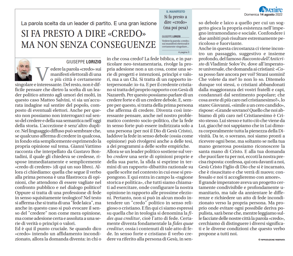 di Giuseppe Lorizio su Avvenire 14 Agosto 2022. Vedere la parola «credo» sui manifesti elettorali di una o più città è certamente singolare e interessante. Del resto, non è difficile pensare che dietro la scelta di un leader politico attento agli umori dei molti, in questo caso Matteo Salvini, vi sia un’accurata indagine sul sentire del popolo, composto di eventuali elettori. Anche per questo non possiamo non interrogarci sul senso del credere e della sua semantica nell’oggi della storia. L’accezione è senz’altro duplice. Nel linguaggio diffuso può sembrare che, se qualcuno afferma di credere…