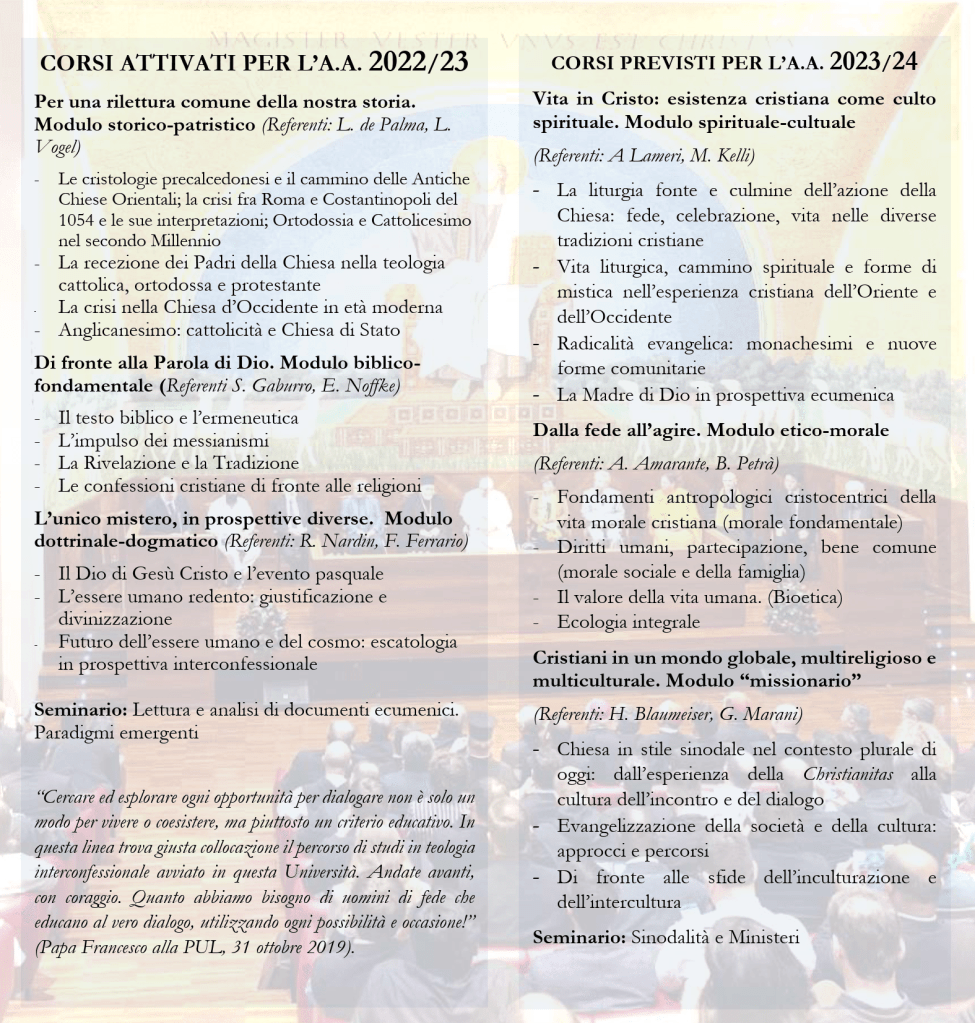 La teologia interconfessionale nasce dall’invito di Papa Francesco: “Cercare ed esplorare ogni opportunità per dialogare non è solo un modo per vivere o coesistere, ma piuttosto un criterio educativo. In questa linea trova giusta collocazione il percorso di studi in teologia interconfessionale avviato in questa Università. Andate avanti, con coraggio. Quanto abbiamo bisogno di uomini di fede che educano al vero dialogo, utilizzando ogni possibilità e occasione!” (Papa Francesco alla PUL, 31 ottobre 2019).