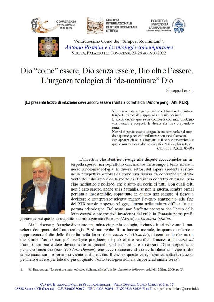 Relazione del prof. Lorizio al XXII simposio Rosminiano a Stresa 24 Agosto 2022