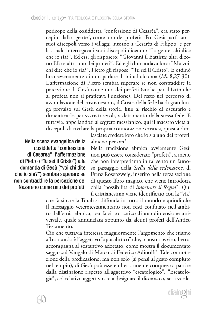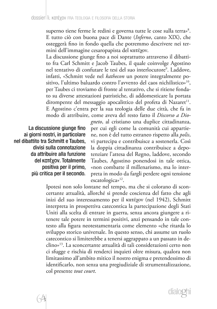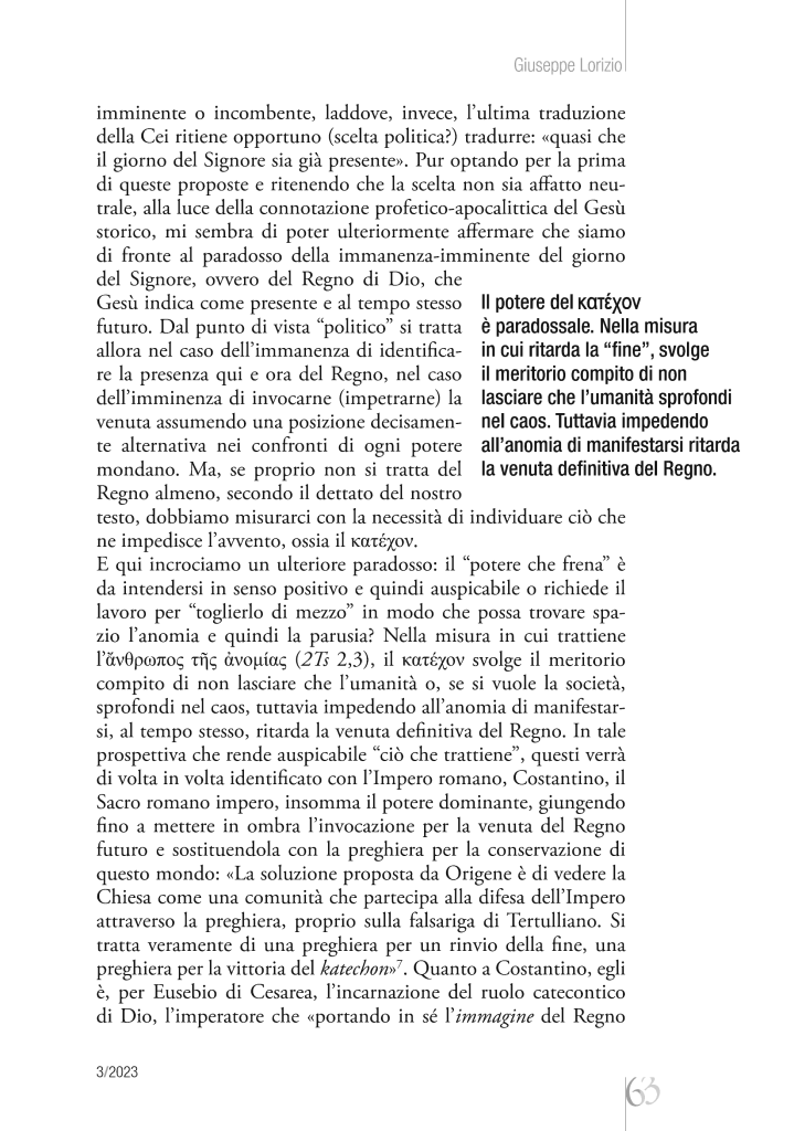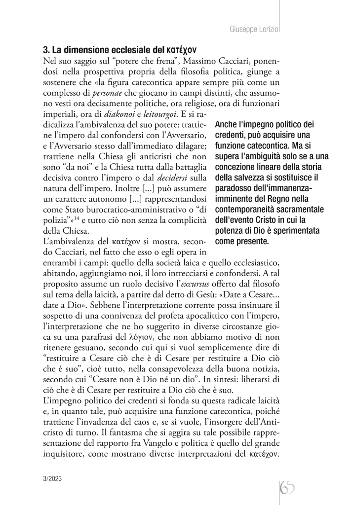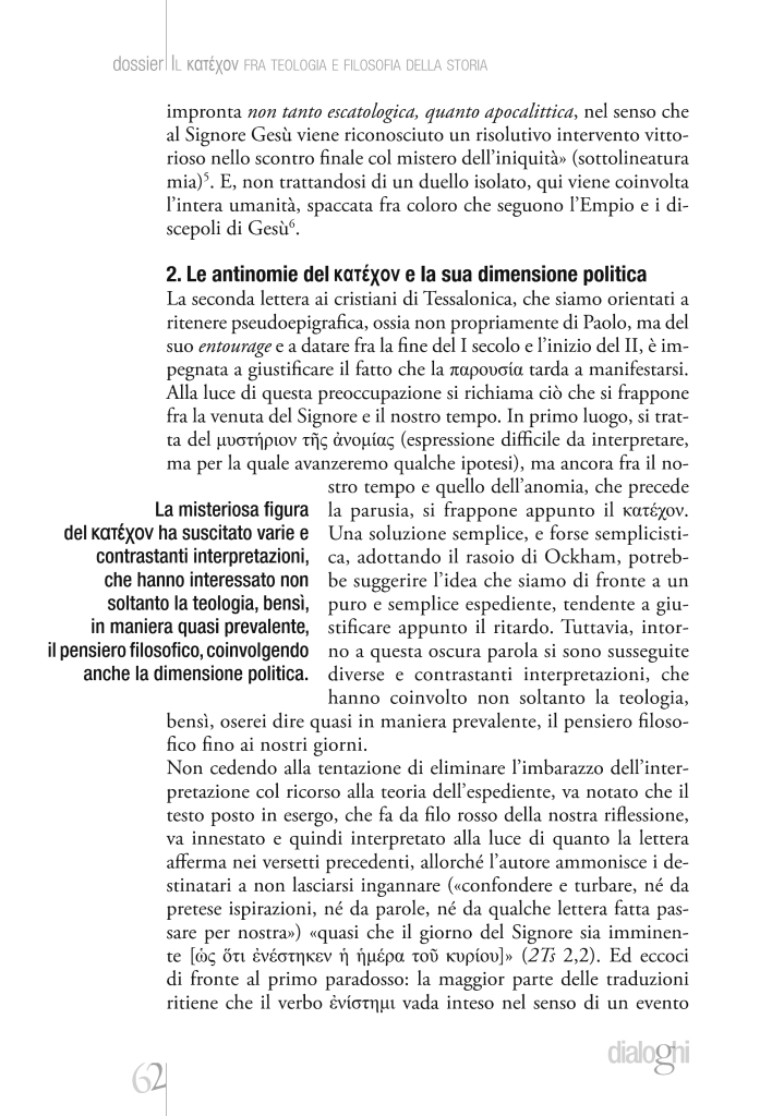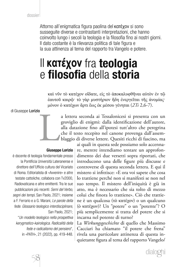 Attorno all’enigmatica figura paolina del Κατέχoν si sono susseguite diverse e contrastanti interpretazioni, che hanno coinvolto lungo i secoli la teologia e la filosofia fino ai nostri giorni. Il dato costante è la rilevanza politica di tale figura e la sua attinenza al tema del rapporto tra Vangelo e potere.