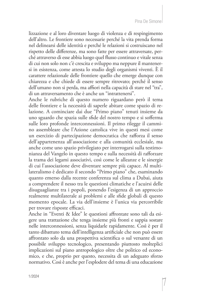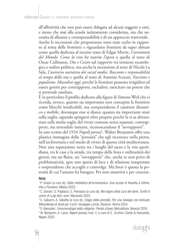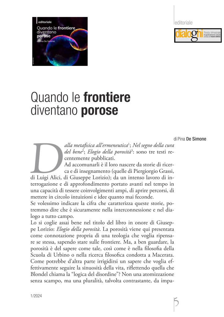 Di Pina de Simone, Editoriale di Dialoghi 2024/1 Dalla metafisica all’ermeneutica; Nel segno della cura del bene; Elogio della porosità: sono tre testi recentemente pubblicati.