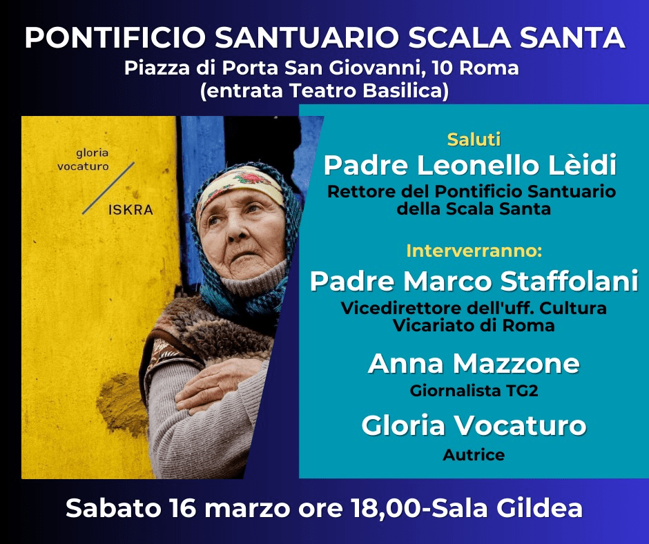 Saluti di Padre Leonello Lèidi, rettore della Scala Santa. Interverranno P. Marco Staffolani, vicedirettore dell’uff. Cultura Diocesi di Roma, Anna Mazzone giornalista Tg2. Sabato 16 Marzo presso Pontificio Santuario Scala Santa – Entrata Teatro Basilica Piazza di Porta San Giovanni, 10 Roma.