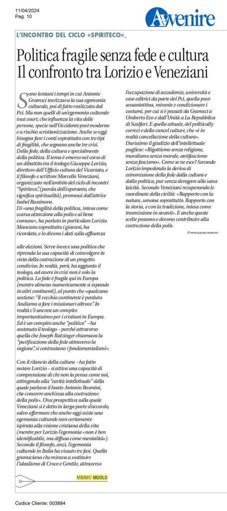 Politica fragile senza fede e cultura. Il confronto tra Lorizio e Veneziani pensarelafede Senza categoria 11 aprile 202411 aprile 2024 1 Minute Condividi: Fai clic per condividere su X (Si apre in una nuova finestra) X Fai clic per condividere su Facebook (Si apre in una nuova finestra) Facebook Mi piace Caricamento... Correlati Pubblicato da pensarelafede Pensare La Fede e Vivere il Vangelo nell'oggi Vedi tutti gli articoli di pensarelafede Pubblicato 11 aprile 202411 aprile 2024