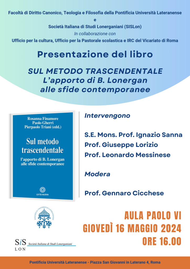 Presentazione del libro: Sul metodo trascendentale. L’apporto di B. Lonergan alle sfide contemporanee. 16 Maggio 2024 Aula Paolo VI – Pontificia Università Lateranense