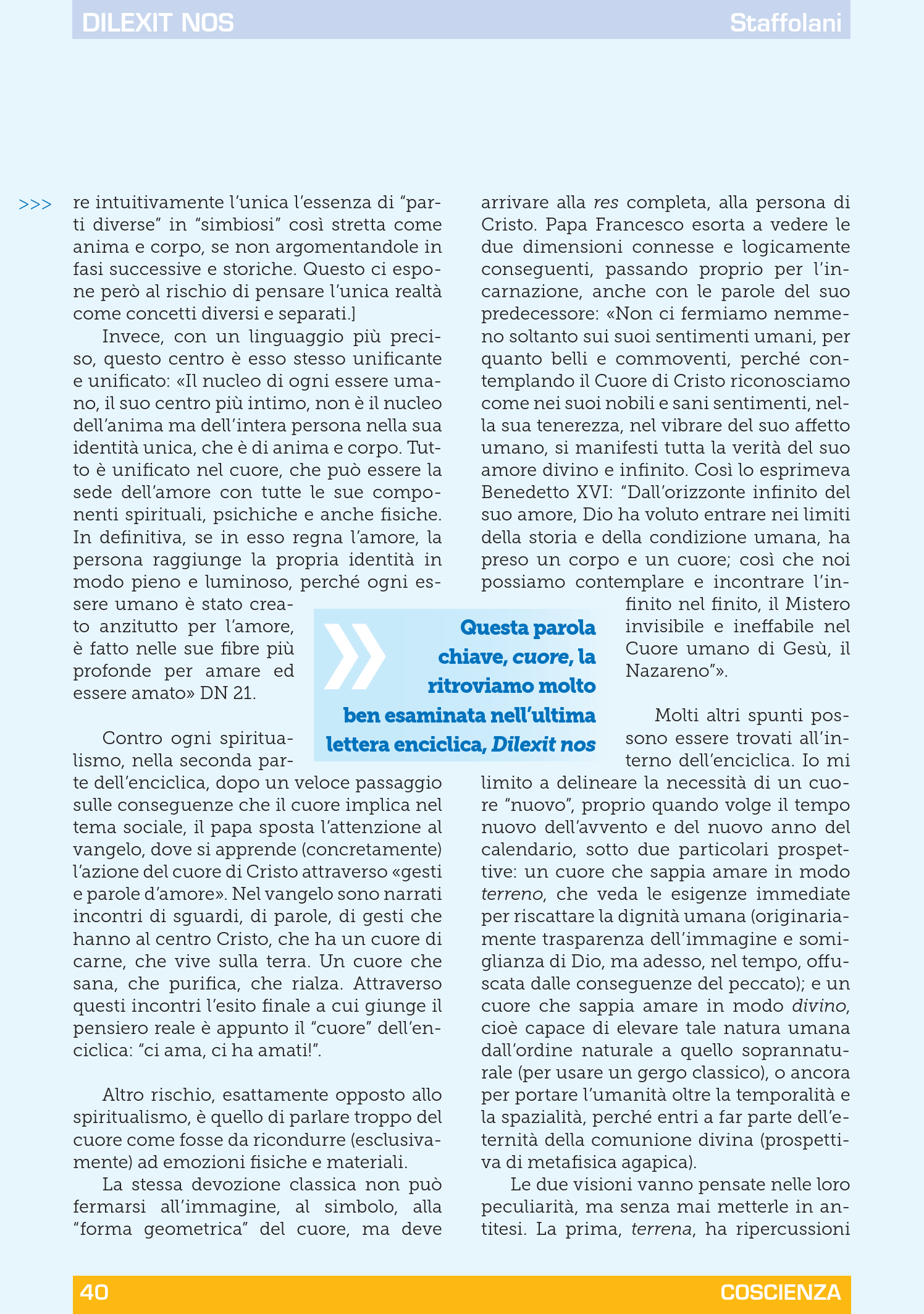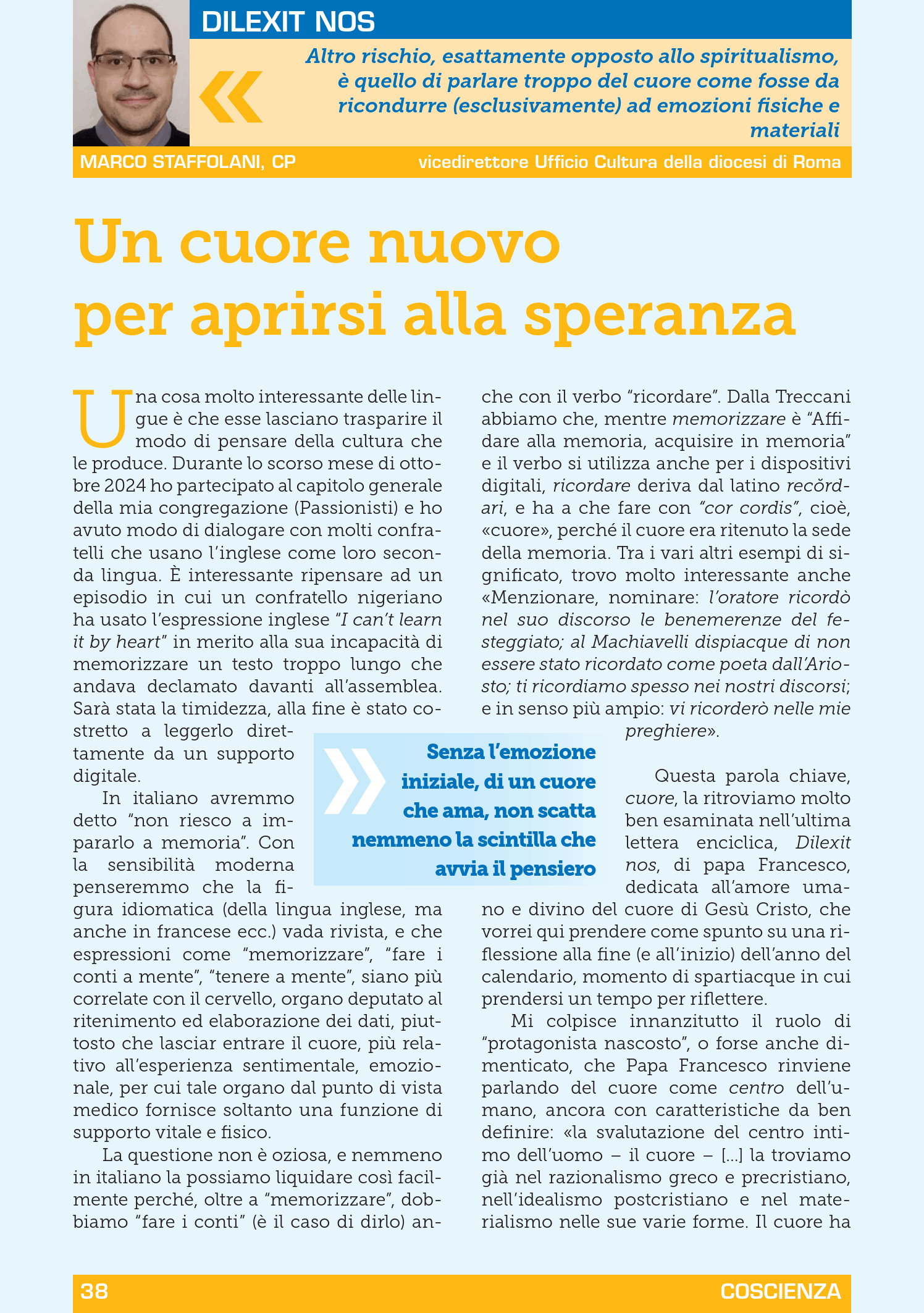 Di Marco Staffolani, su Coscienza 3/2024. Una cosa molto interessante delle lingue è che esse lasciano trasparire il modo di pensare della cultura che le produce. Durante lo scorso mese di ottobre 2024 ho partecipato al capitolo generale della mia congregazione (Passionisti) […] È interessante ripensare ad un episodio in cui un confratello nigeriano ha usato l’espressione inglese “I can’t learn it by heart” in merito alla sua incapacità di memorizzare un testo troppo lungo che andava declamato davanti all’assemblea. […] In italiano avremmo detto “non riesco a impararlo a memoria” […] La questione non è oziosa, e nemmeno in italiano la possiamo liquidare così facilmente perché, oltre a “memorizzare”, dobbiamo “fare i conti” (è il caso di dirlo) anche con il verbo “ricordare”. Dalla Treccani abbiamo che, mentre memorizzare è “Affidare alla memoria, acquisire in memoria” […che è usato anche in espressioni] come ti ricordiamo spesso nei nostri discorsi; e in senso più ampio: vi ricorderò nelle mie preghiere».