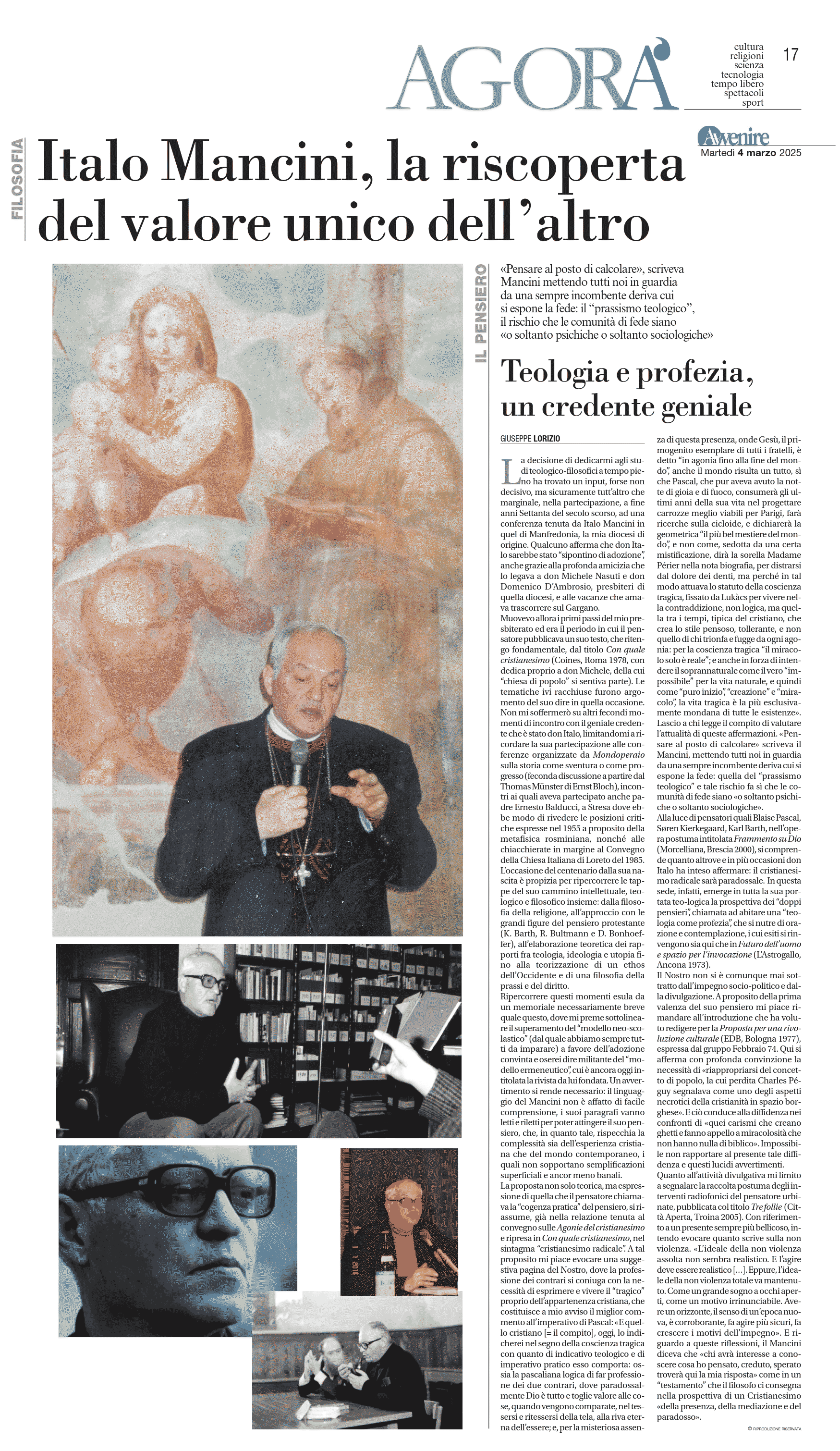 [di Don Giuseppe Lorizio su Avvenire 4 Marzo 2025] La decisione di dedicarmi agli studi teologico-filosofici a tempo pieno ha trovato un input, forse non decisivo, ma sicuramente tutt’altro che marginale, nella partecipazione, a fine anni Settanta del secolo scorso, ad una conferenza tenuta da Italo Mancini in quel di Manfredonia, la mia diocesi di origine. Qualcuno afferma che don Italo sarebbe stato “sipontino di adozione”, anche grazie alla profonda amicizia che lo legava a don Michele Nasuti e don Domenico D’Ambrosio, presbiteri di quella diocesi, e alle vacanze che amava trascorrere sul Gargano. Muovevo allora i primi passi del mio presbiterato ed era il periodo in cui il pensatore pubblicava un suo testo, che ritengo fondamentale, dal titolo Con quale cristianesimo (Coines, Roma 1978, con dedica proprio a don Michele, della cui “chiesa di popolo” si sentiva parte). Le tematiche ivi racchiuse furono argomento del suo dire in quella occasione. Non mi soffermerò su altri fecondi momenti di incontro con il geniale credente che è stato don Italo, limitandomi a ricordare la sua partecipazione agli incontri organizzati da Mondoperaio sulla storia come sventura o come progresso, cui aveva partecipato anche padre Ernesto Balducci, nonché alle chiacchierate in margine al Convegno della Chiesa Italiana di Loreto del 1985.