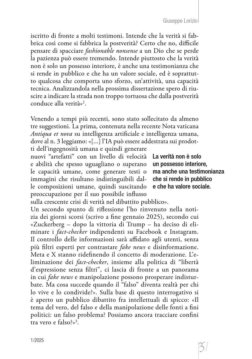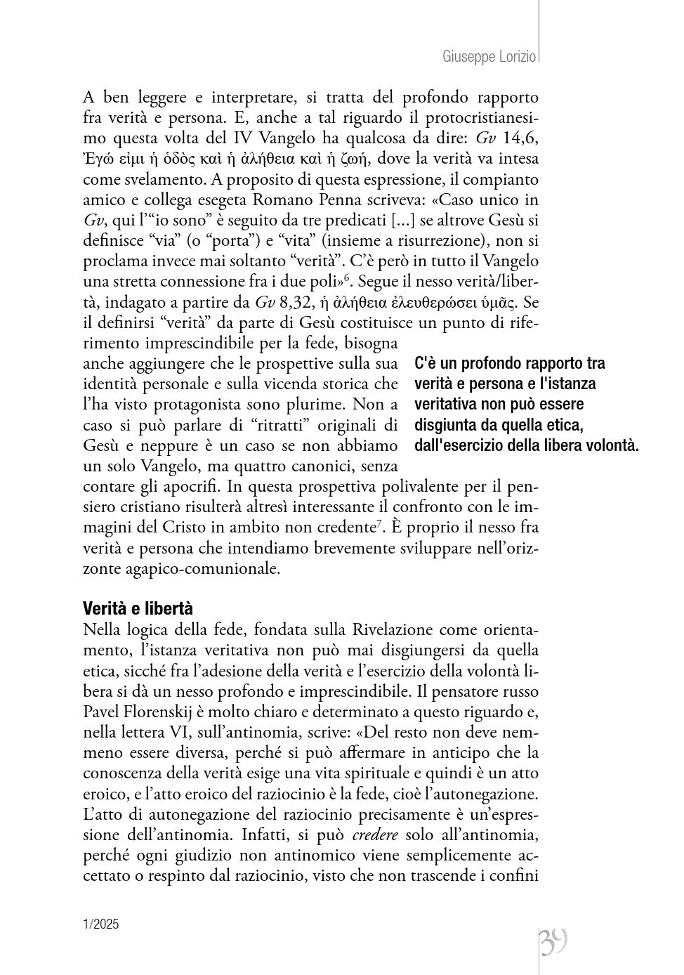 Nella logica della fede fondata sulla Rivelazione, l’adesione alla verità si dà nell’esercizio della libera volontà e nell’amore. L’orizzonte comunionale sottrae il credente al rischio del relativismo ed è indicazione decisiva anche in ordine al dibattito pubblico sulla verità. [Di Giuseppe Lorizio, su Dialoghi 1/2025]