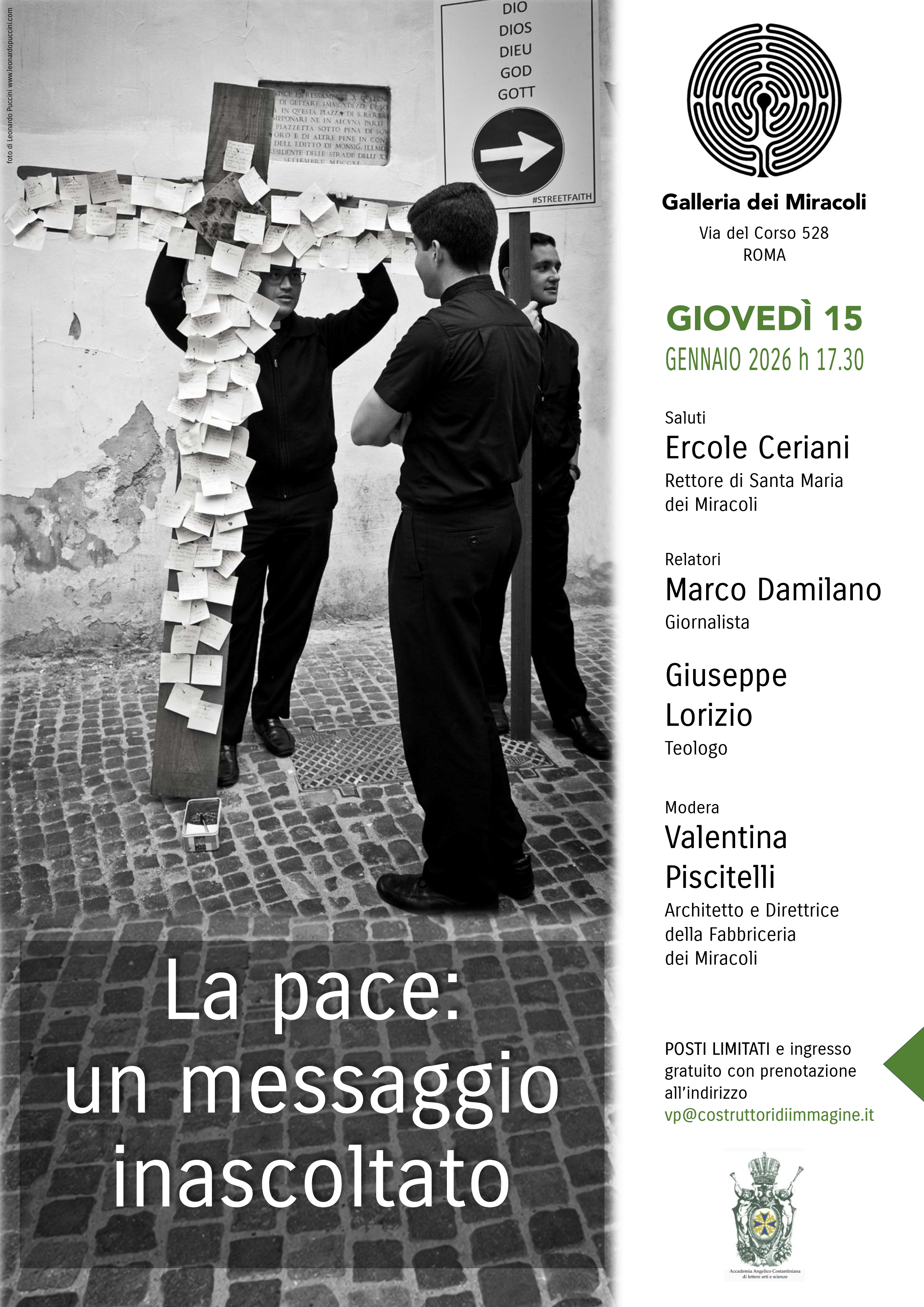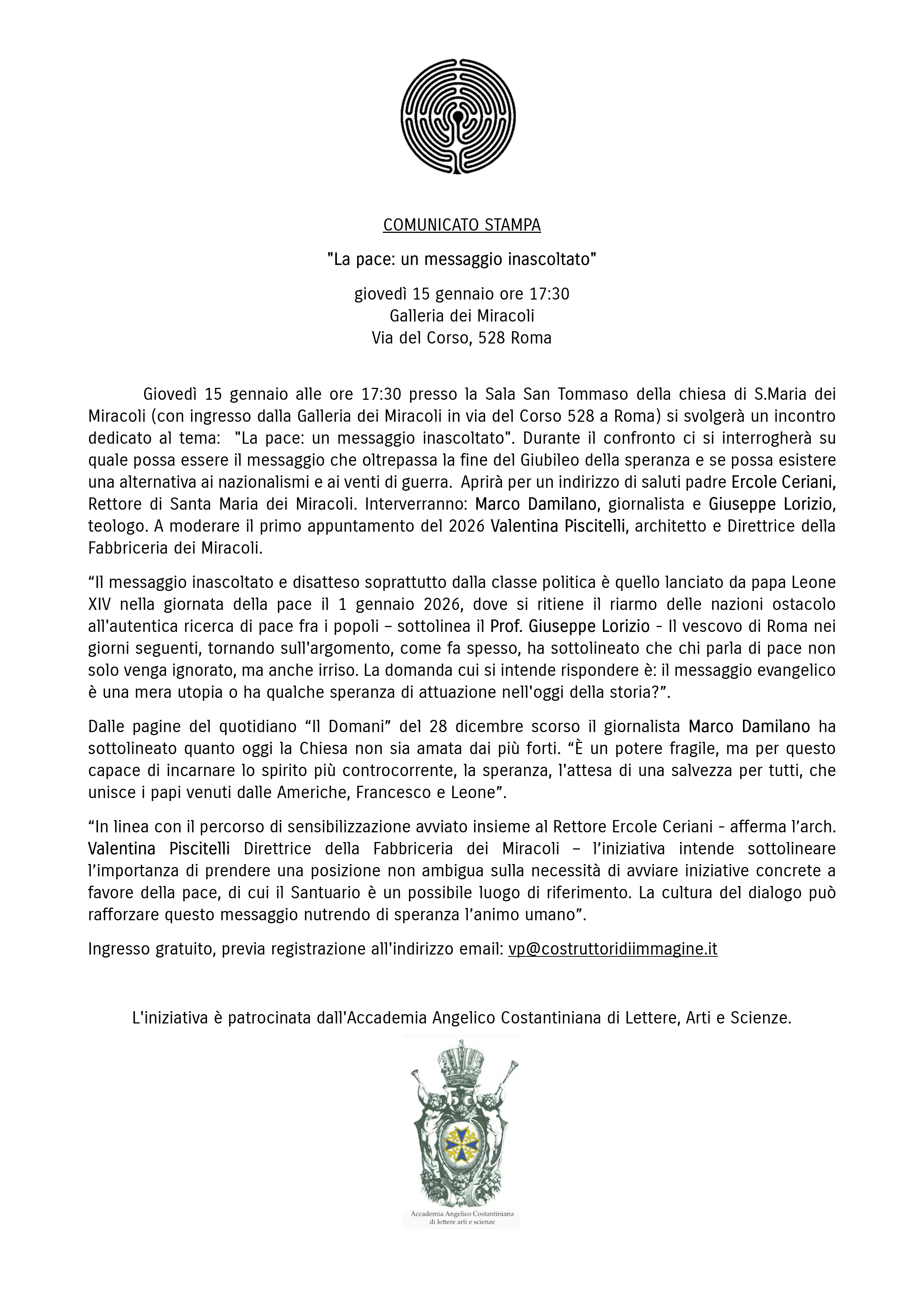 Giovedì 15 gennaio alle ore 17:30 presso la Sala San Tommaso della chiesa di S. Maria dei Miracoli (con ingresso dalla Galleria dei Miracoli in via del Corso 528 a Roma) si svolgerà un incontro dedicato al tema: “La pace: un messaggio inascoltato”. Durante il confronto ci si interrogherà su quale possa essere il messaggio che oltrepassa la fine del Giubileo della speranza e se possa esistere una alternativa ai nazionalismi e ai venti di guerra. Aprirà per un indirizzo di saluti padre Ercole Ceriani, Rettore di Santa Maria dei Miracoli. Interverranno: Marco Damilano, giornalista e Giuseppe Lorizio, teologo. A moderare il primo appuntamento del 2026 Valentina Piscitelli, architetto e Direttrice della Fabbriceria dei Miracoli.