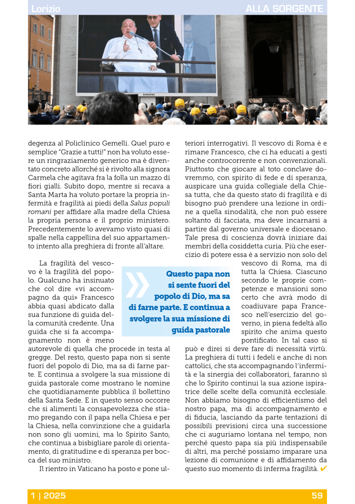 Di Giuseppe Lorizio su Coscienza, MEIC (Marzo 2025) La Chiesa e, oserei dire, le Chiese stanno vivendo un momento di grande fragilità e sperimentando la caducità della condizione umana, mentre il vescovo di Roma è stato sottoposto a cure mediche nella struttura ospedaliera del Policlinico Gemelli, che ora continuano a Santa Marta. I limiti della Chiesa, soprattutto nel nostro vecchio continente, si mostrano non solo nel calo della partecipazione ai momenti di culto e di vita comunitaria, ma in atteggiamenti di sfiducia verso un’istituzione che ha bisogno di riacquisire la credibilità perduta a causa di scandali e deficienze in rapporto all’Evangelo che è chiamata ad annunziare.