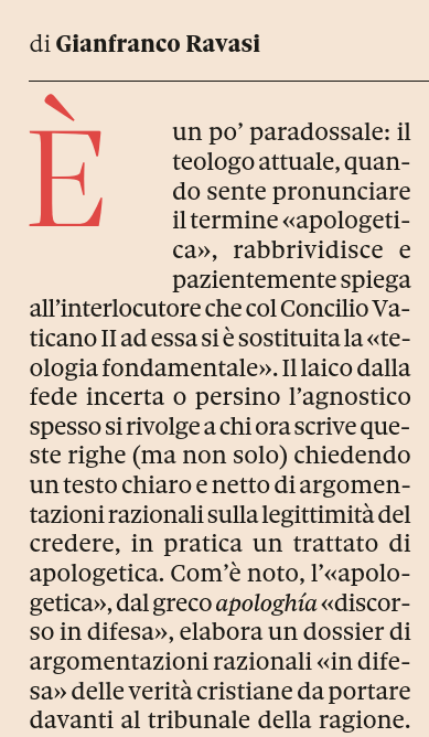 E’ un po’ paradossale: il teologo attuale, quando sente pronunciare il termine «apologetica», rabbrividisce e pazientemente spiega