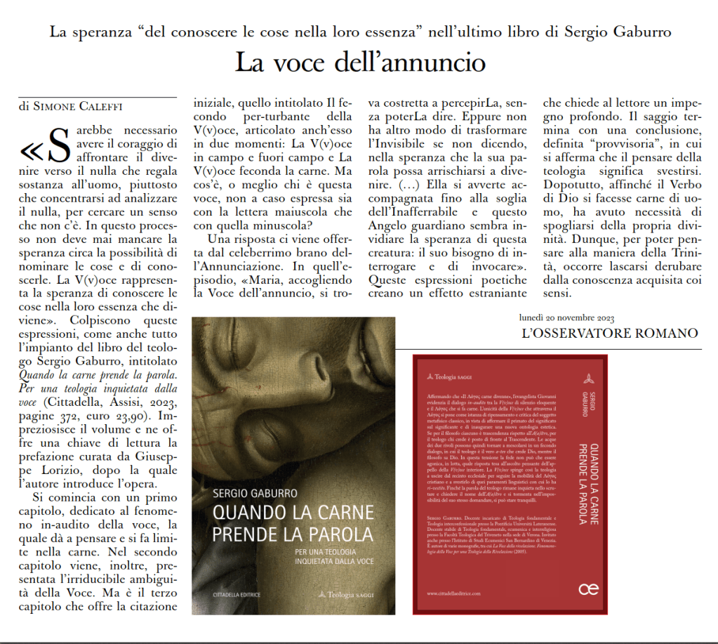 Recensione di Simone Caleffi, su Osservatore Romano, 20 Novembre 2023, del libro di Sergio Gaburro, Quando la carne prende la Parola. Per una teologia inquietata dalla Voce