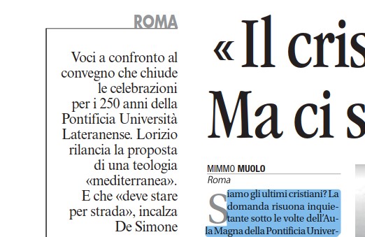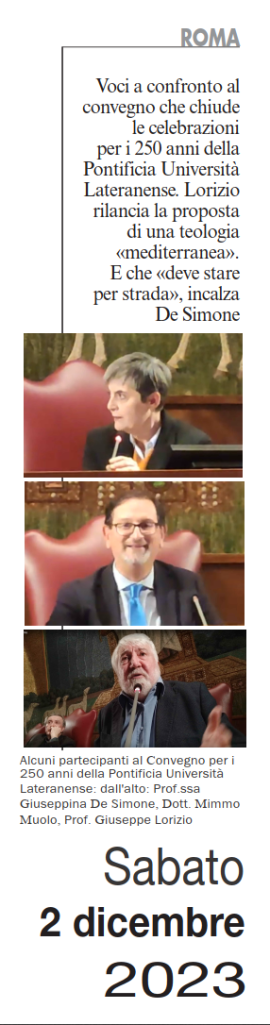 Di Mimmo Muolo, su Avvenire di Sabato 2 Dicembre 2023. Siamo gli ultimi cristiani? La domanda risuona inquietante sotto le volte dell’Aula Magna della Pontificia Università Lateranense. Ma non è uno scenario apocalittico quello si delinea nel corso del convegno organizzato per concludere le celebrazioni dei 250 anni dell’Ateneo dei Papi. Tutt’altro. Anzi come riassume nelle sue conclusioni monsignor Giuseppe Lorizio, che alla Lateranense è professore emerito di teologia fondamentale, può costituire l’occasione per «ripensare l’annuncio del Vangelo nella storia e il ruolo della teologia nell’ambito della nuova evangelizzazione». La domanda era stata posta nella sua relazione da un altro teologo, Brunetto Salvarani. Lorizio nelle sue conclusioni aggiunge una postilla al quesito: «Visto che in altri contesti il cristianesimo fiorisce, siamo forse gli ultimi cristiani del mondo occidentale? Se, erroneamente, identificassimo il cristianesimo con l’Occidente, finito il secondo, dovremmo decretare anche la fine del primo. Ma pur non essendo così, la questione non è da poco, poiché il cristianesimo occidentale non va abbandonato. Grazie alla molteplicità delle sue radici culturali (Roma, Atene, Gerusalemme), esso ci salva infatti dal pericolo del fondamentalismo». E qui viene in primo piano la teologia, cioè quell’intelligenza della fede che permette di avere uno sguardo profondo sul presente e sul futuro, senza cedere ai rischi di un certo politically correct cucinato in salsa ecclesiale. Come ha fatto notare il prorettore Riccardo Ferri, la riflessione teologica articolata attorno a due fuochi, il kerygma (primo annuncio) e il kairos («tempo opportuno, con le sue istanze e provocazioni»), attraverso il contributo dei quattro relatori coinvolti (oltre a Salvarani e Lorizio, anche Elizabeth Green e Kurt Appel) ha permesso di mettere a fuoco alcune problematiche di fondo. La necessaria risposta alle paure degli uomini e delle donne del nostro tempo, ad esempio; l’annuncio originario di Gesù risorto di fronte alle sfide che la natura, spesso stravolta con le catastrofi che ne conseguono, e i rapporti umani, spesso distorti con le guerre e i conflitti che ne derivano, impongono al pensiero credente; il rapporto tra il maschile e il femminile nella Chiesa, oltre che nella società. Soprattutto, però, va intercettata la ricerca di senso che sale dal vissuto di ogni giorno. Per la teologa Giuseppina De Simone, «la teologia deve stare per strada», al fine di riconoscere nella vita delle persone l’azione di Dio, spesso silenziosa e misteriosa», ma non per questo meno reale. Da questa «azione della grazia ha aggiunto la studiosa – nessuno è escluso, perché Dio è vicino a tutti». Tocca dunque al teologo, riconoscere quel «brusio degli angeli» e quelle «tracce di trascendenza» che possono spuntare dove meno te lo aspetti. A tal proposito, De Simone, riprendendo la metafora di un libro di Lorizio, ha ricordato che l’opera dei teologi e delle teologhe è come quella di una spigolatrice, che va cercando i semi del Verbo dispersi nell’esistenza, «perché anche da questi semi si può ricavare il pane della vita». Nel corso della tavola rotonda sul tema “Credere nel tempo oltre il tempo”, è stato poi sottolineato anche il rapporto necessario con le realtà ultime. «Tempo ed eternità – ha ricordato il cristologo Leonardo Paris – non sono in rapporto dialettico fra loro nella visione cristiana, ma in relazione. Il tempo infatti viene da Dio e a Dio ritorna. E anche su questa prospettiva va effettuato un nuovo lavoro teologico». Specie alla luce della filosofia moderna e contemporanea, che sembra aver chiuso invece il Cielo sopra la testa dell’uomo, e di quella che è stata definita la «la metamorfosi di Dio» nel sentire comune (sostituzione di un vago spiritualismo all’idea cristiana di un Dio personale, cioè di un Tu con il quale dialogare). Lo studioso di Hegel, Pierluigi Valenza, ha notato che oggi «il Cielo va colto negli occhi dell’altro» e che proprio perché siamo tutti sotto lo stesso cielo, va pensata una «trascendenza dell’alterità», fondamentale per costruire rapporti più umani. Alla giornata di studio hanno portato il loro saluto e contributo il rettore della Lateranense, monsignor Alfonso Amarante e il decano della Facoltà teologica Angelo Lameri. Una facoltà che sui temi della “teologia evangelizzante”, come direbbe papa Francesco, è all’avanguardia. Monsignor Lorizio ha citato a tal proposito alcuni lavori concernenti la transizione digitale e la sua valenza metafisica e teologica (tra gli altri i dottorati di Marco Staffolani sul principio di causalità e di Giovanni Amendola sulla ragione all’altezza dell’umano), rilanciando poi da un lato la proposta di una teologia mediterranea («siamo ancora troppo tributari di quella tedesca»), dall’altro «l’urgenza, di abitare teologicamente il tempo che ci separa dalla prossima seduta sinodale, offrendo da parte di chi si occupa professionalmente dell’intelligenza della fede contributi relativi allo sviluppo della dottrina cristiana, secondo il dettato di John Henry Newman».