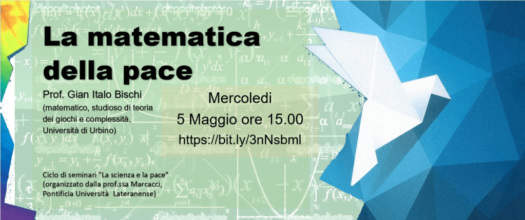 Per il ciclo di lezioni aperte a tutti “Teologia tra scienza e fantascienza, l’immaginario della fede, Mercoledi 5 Maggio alle ore 15.00 proponiamo l’intervento “La matematica della pace” con il prof. Bischi e la prof.ssa Marcacci. Piattaforma Webex https://bit.ly/3nNsbml (max. 100 posti)