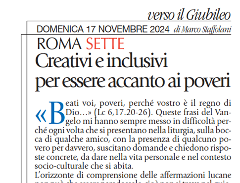 Continua a leggere: Creativi ed inclusivi per essere accanto ai poveri.Che significa allora andando “verso il Giubileo”, in data 17 Novembre 2024, in cui si celebra l’VIII giornata mondiale per i poveri, questa presenza di coloro che Gesù proclama beati, e che papa Francesco ci ricorda al n. 16 della Spes non confundit?