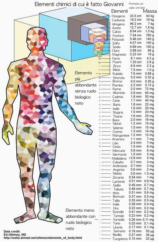 Ecco gli elementi chimici di cui è fatto Giovanni (e ogni altro essere umano), con relativa massa e volume che potrebbero occupare.
