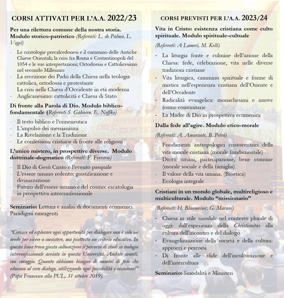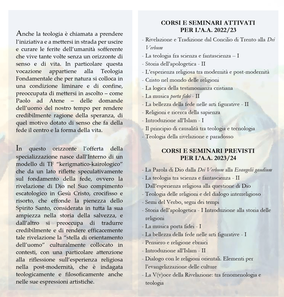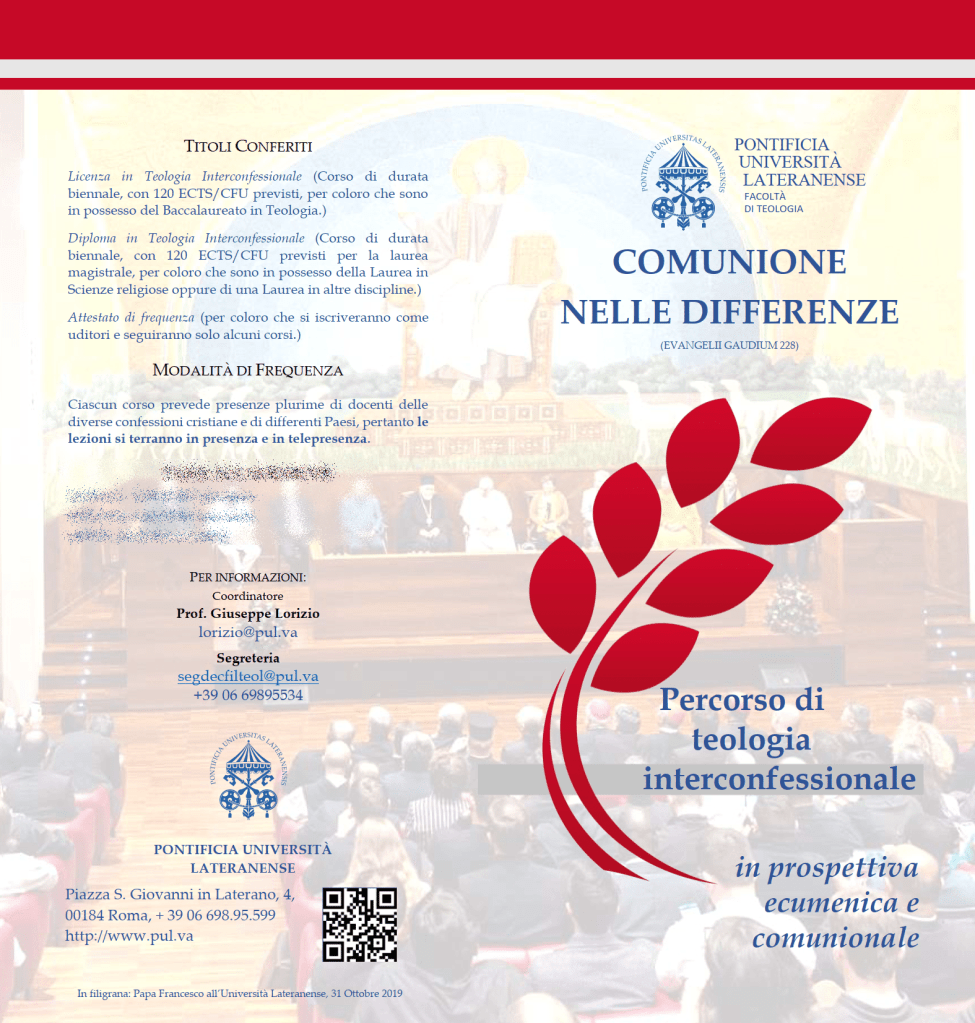 Qui sotto l’offerta formativa della TF (teologia fondamentale) e della TI (teologia interconfessionale) attivate alla Pontificia Università Lateranense e relativi contatti per maggiori informazioni e per iscrizioni