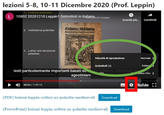 Cliccare sul simbolo di ingranaggio bianco in fondo a destra e poi la voce sottotitoli